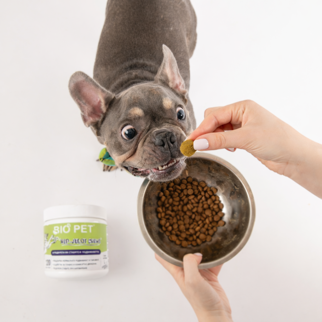 Като част от ежедневната рутина може да се добави и хранителна подкрепа като Hip and Joint Chews от BIO PET. Формулата съдържа глюкозамин, хондроитин, MSM и колаген - съставки, които подпомагат поддържането на здрав хрущял и ставна структура. Oмега-3 мастни киселини подпомагат за нормалния възпалителен баланс, както и витамини и минерали, които подкрепят общото състояние на ставите.